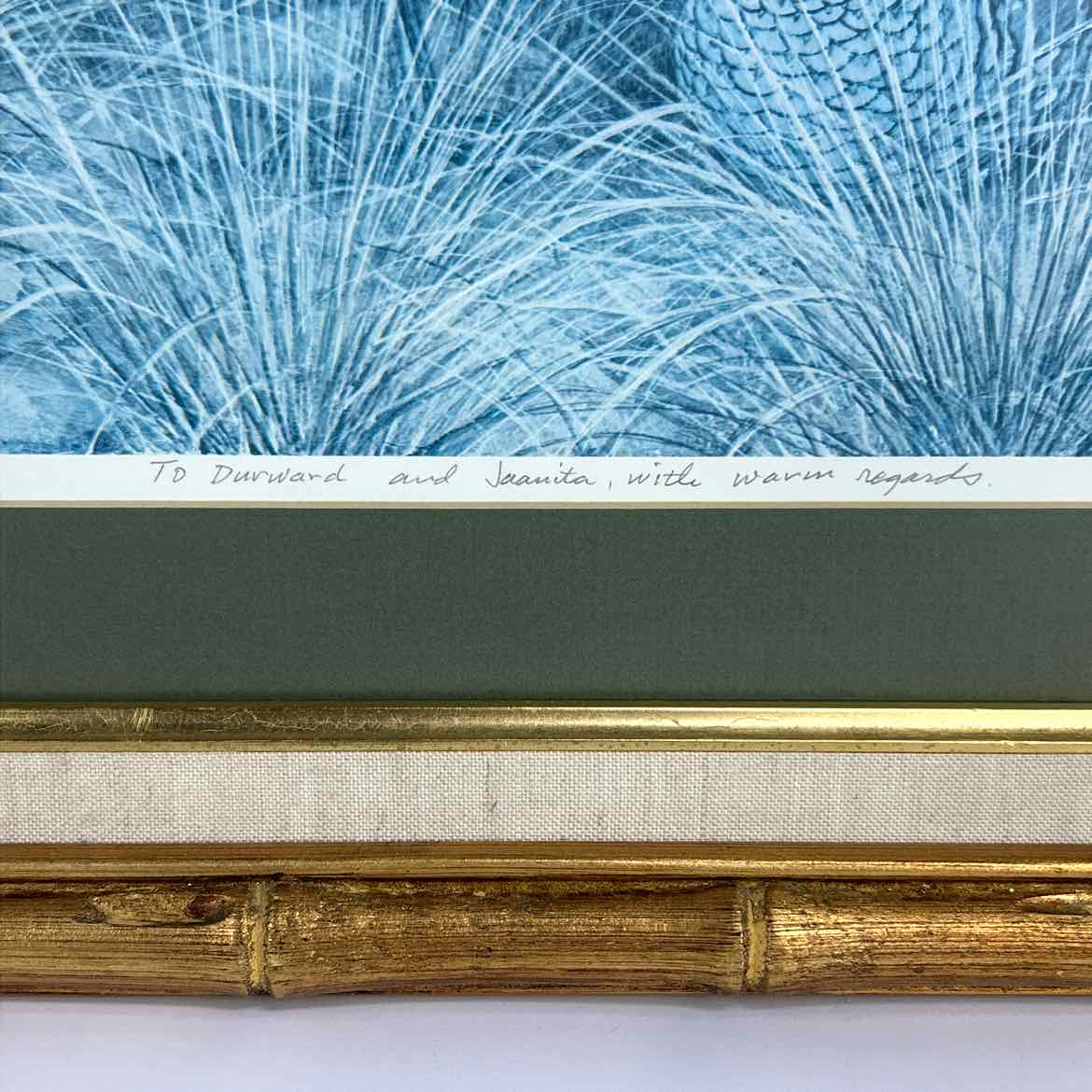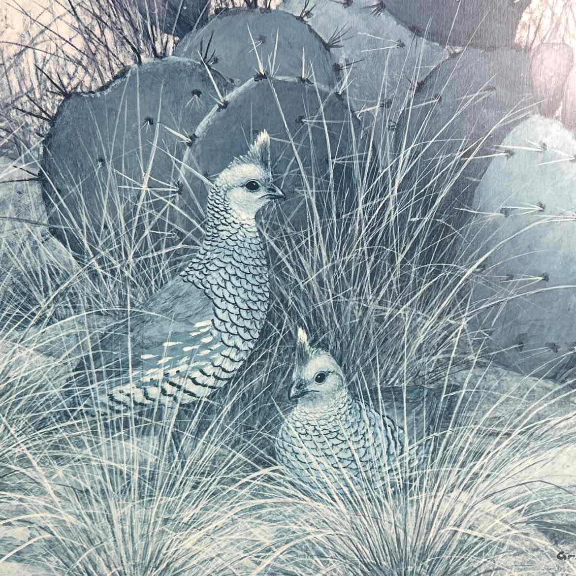 Framed limited edition print of quails in prickly pear cactus. The print has faded to blue, but the frame is spectacular. These wooden faux bamboo gold frames are hard to find and a real treasure.