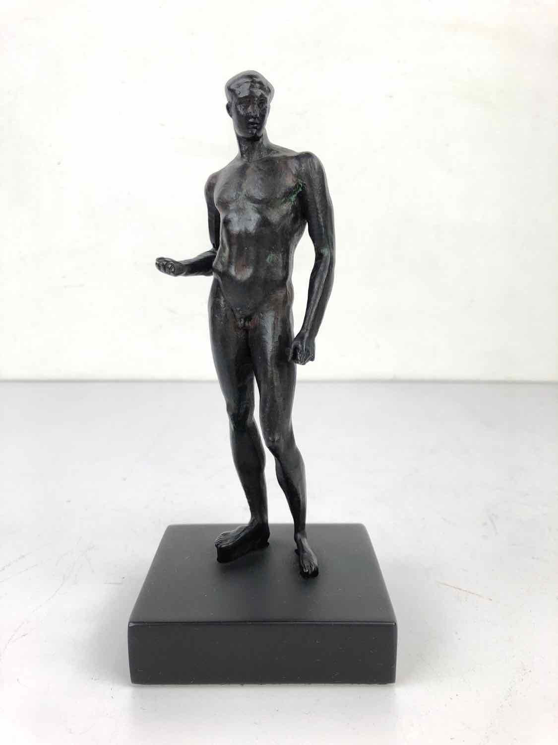 Vintage Metropolitan Museum of Art reproduction sculpture of a nude standing Greco-Roman athlete. It is made of resin with a black finish to look like a bronze. In excellent vintage condition and stamped on the back MMA-WAG.