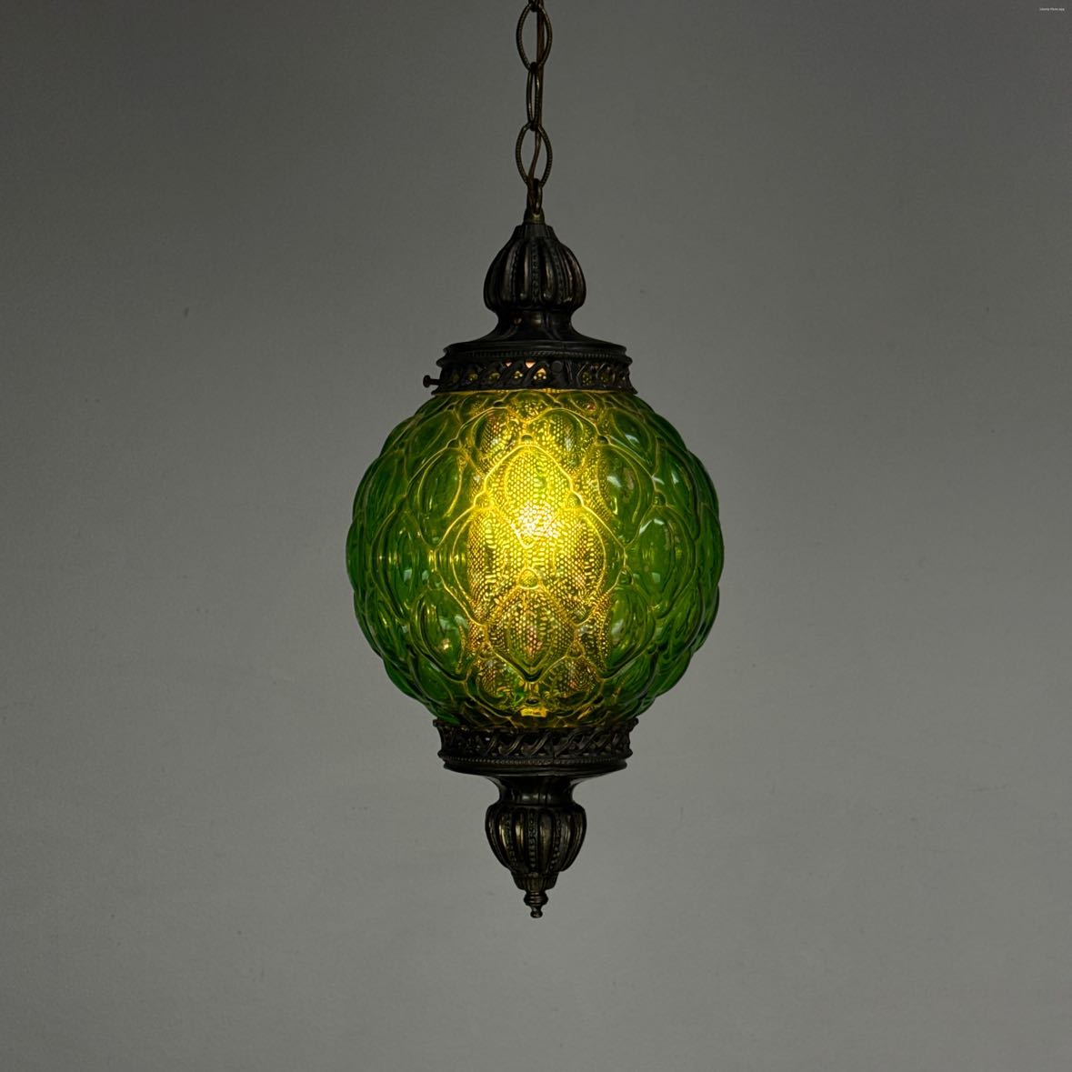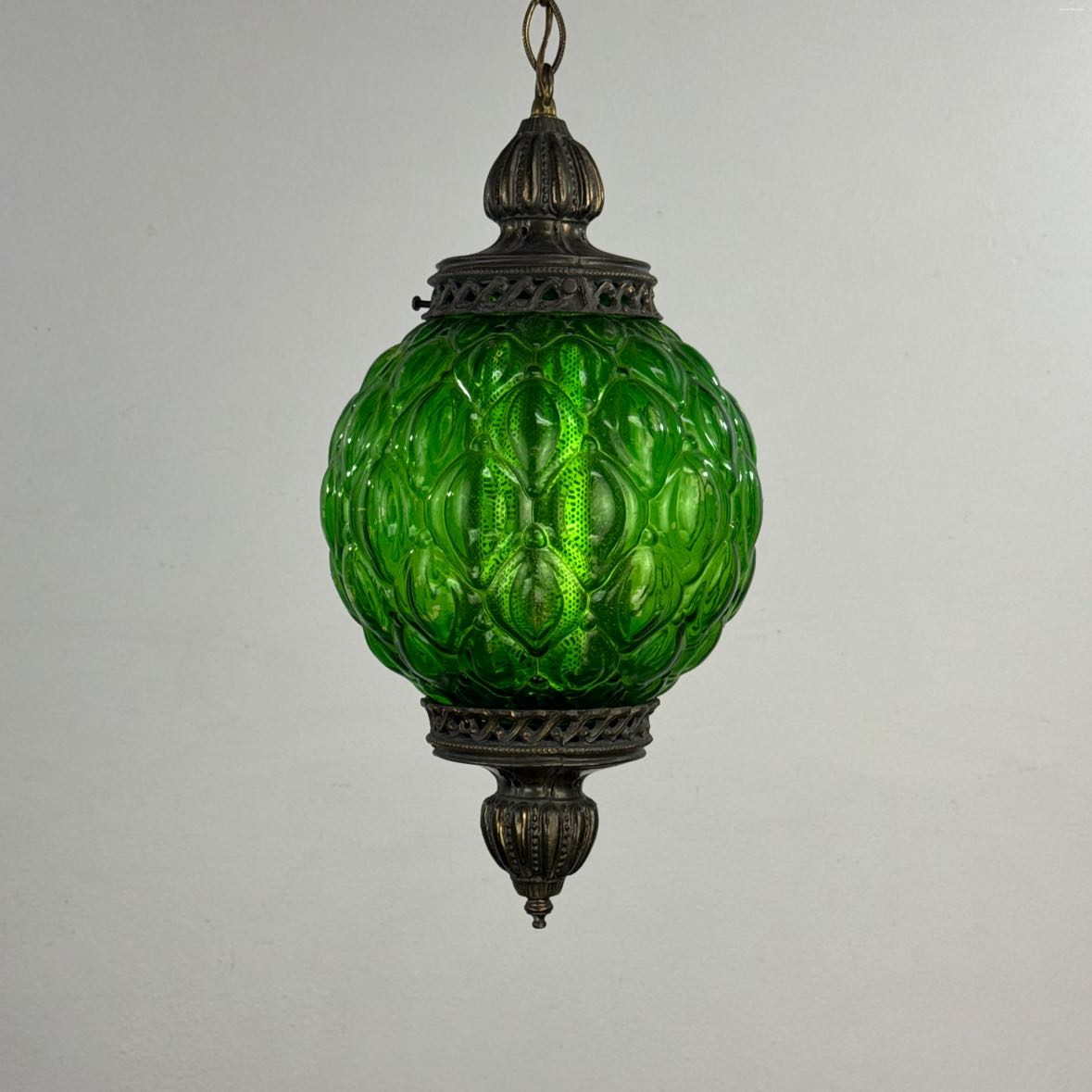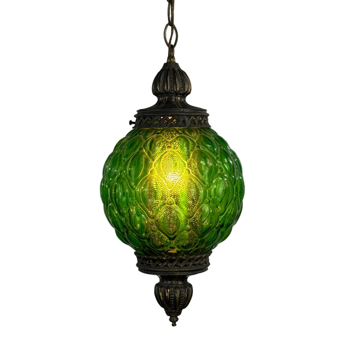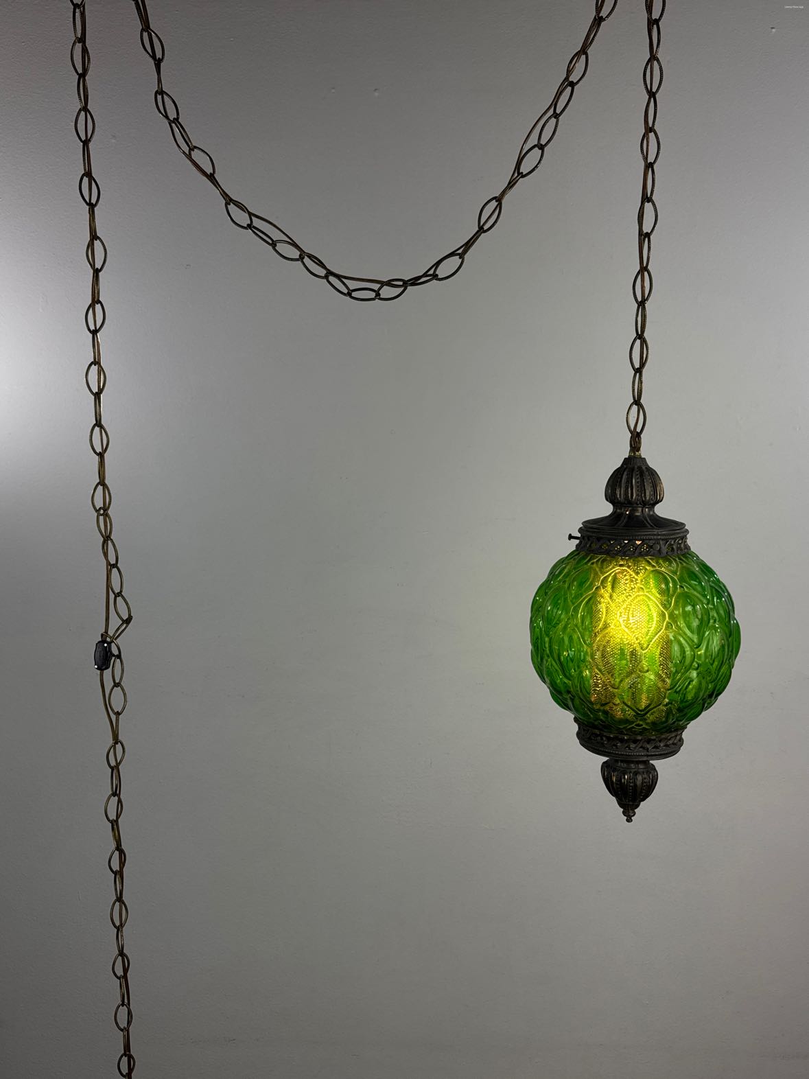 Mid-century green glass globe swag with a metal chain. It plugs into the wall and has an in-cord switch. The bright green glass looks so pretty when lit up, but the green finish was worn in some areas as shown.