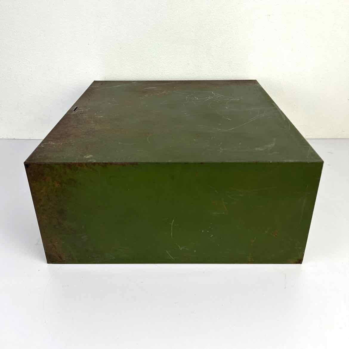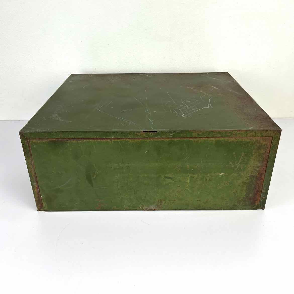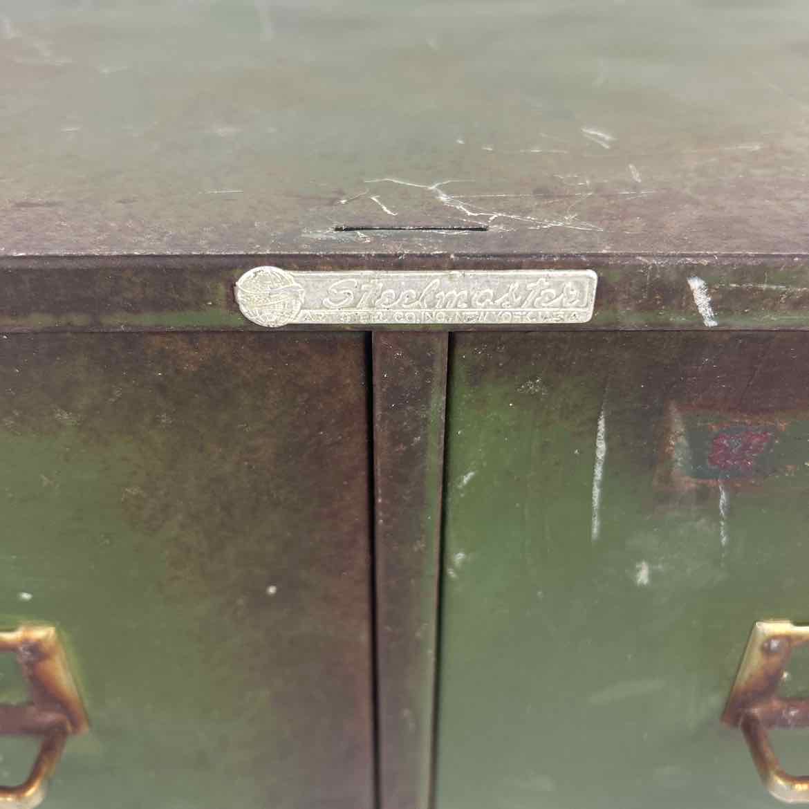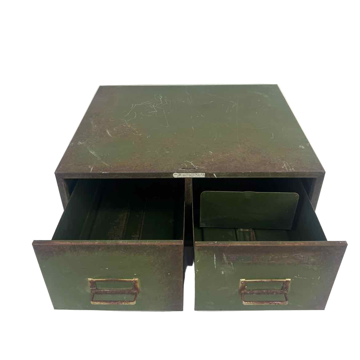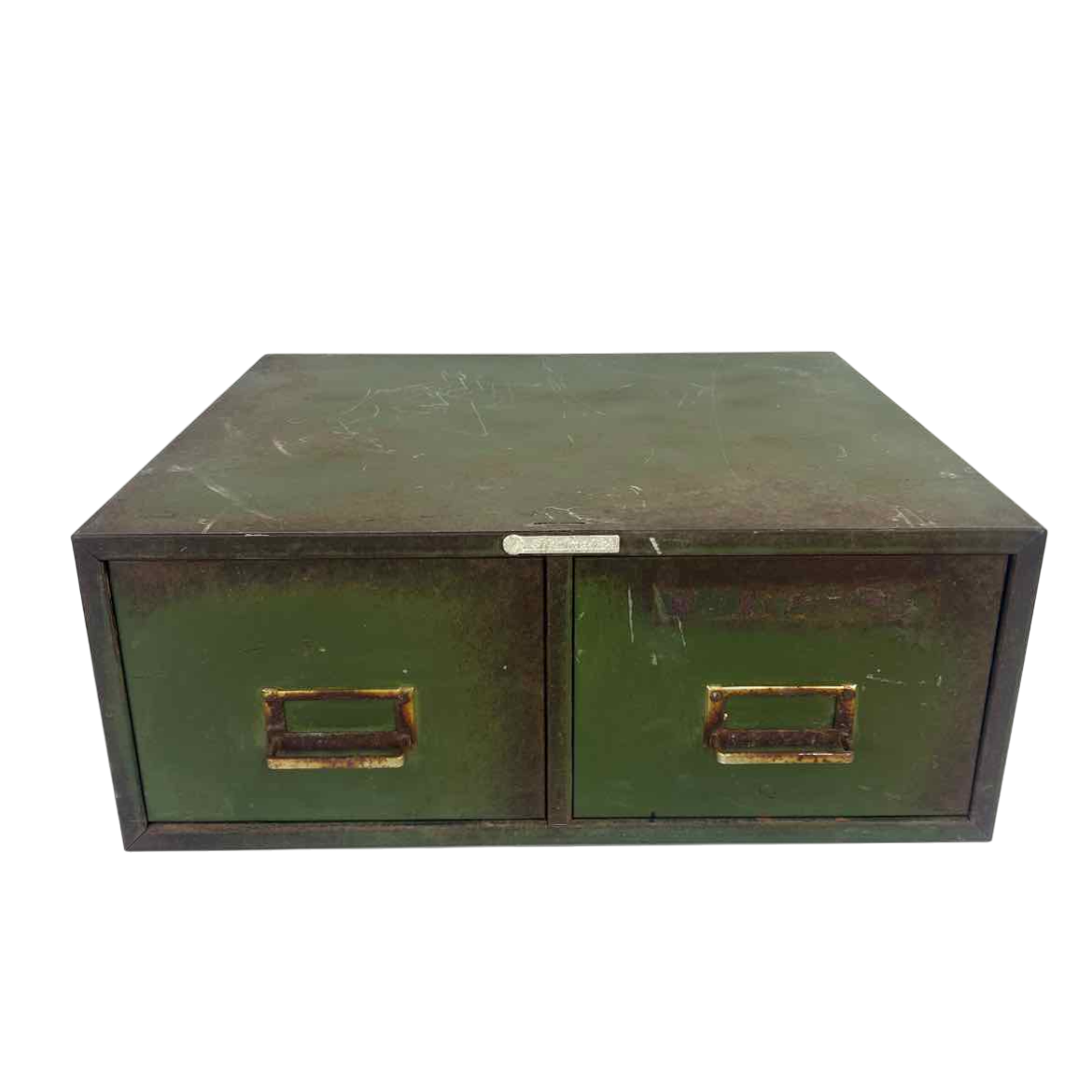 Green metal 2-drawer file box by Steelmaster, in good vintage condition with finish wear and rusty patina from age. These are great for organizing clutter around the house and adding industrial vibes.