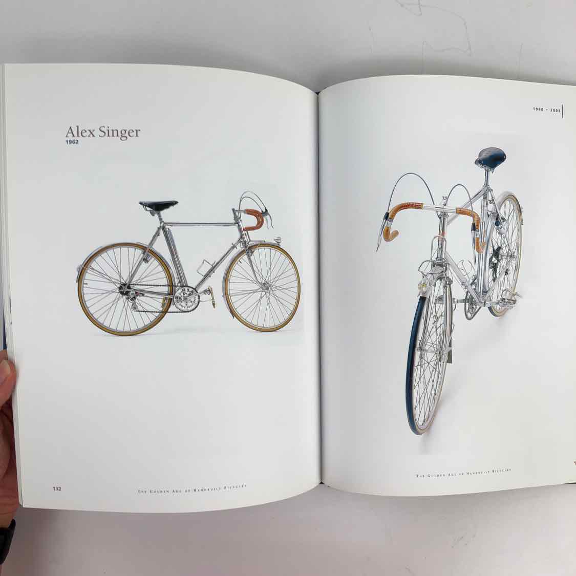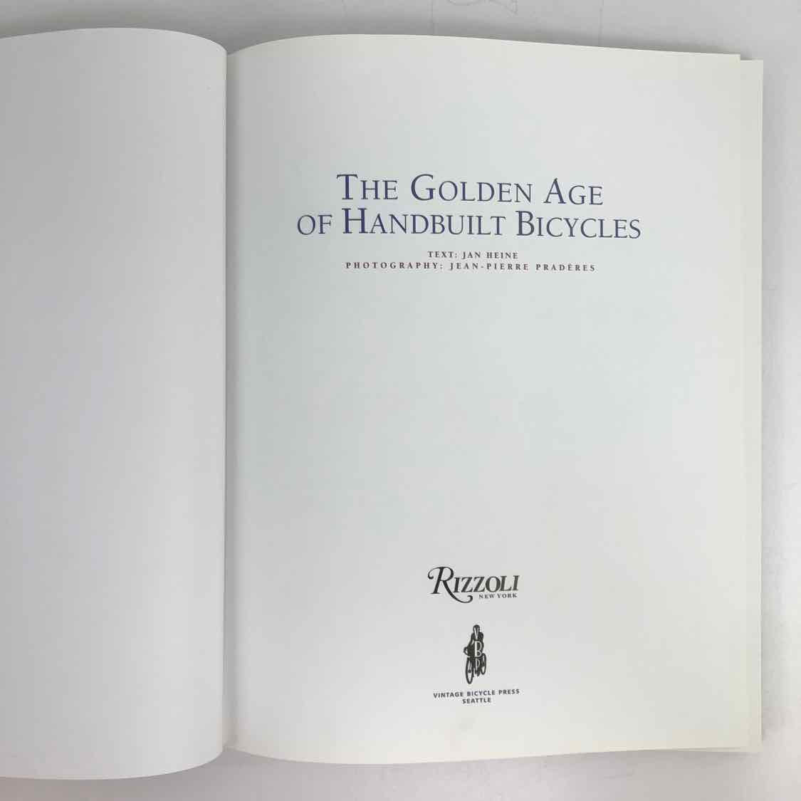 The Golden Age of Handbuilt Bicycles, a collectible coffee table book in good vintage condition with light wear to the jacket and cover edge. This is an amazing piece for a cycling enthusiast, timeless and full of information.