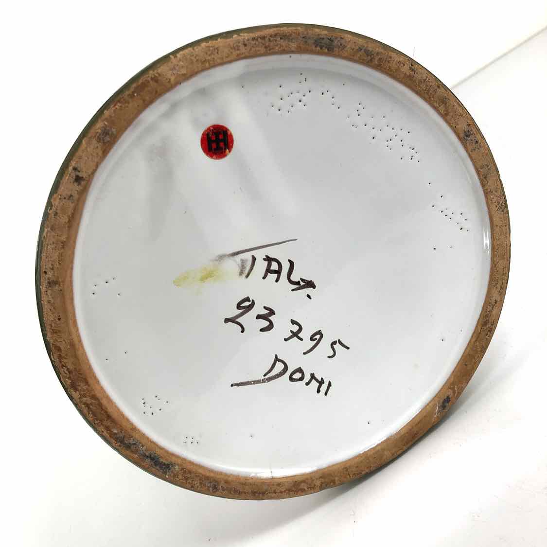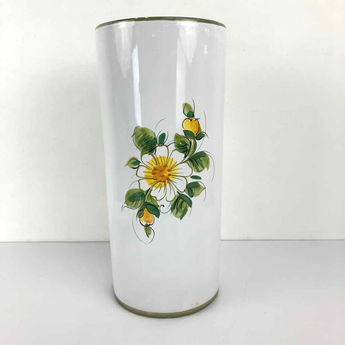 Italian pottery umbrella stand with hand decorated flowers in white, orange, yellow and green on the front and back with green trim. It has a few small glaze chips but is in otherwise great vintage condition.