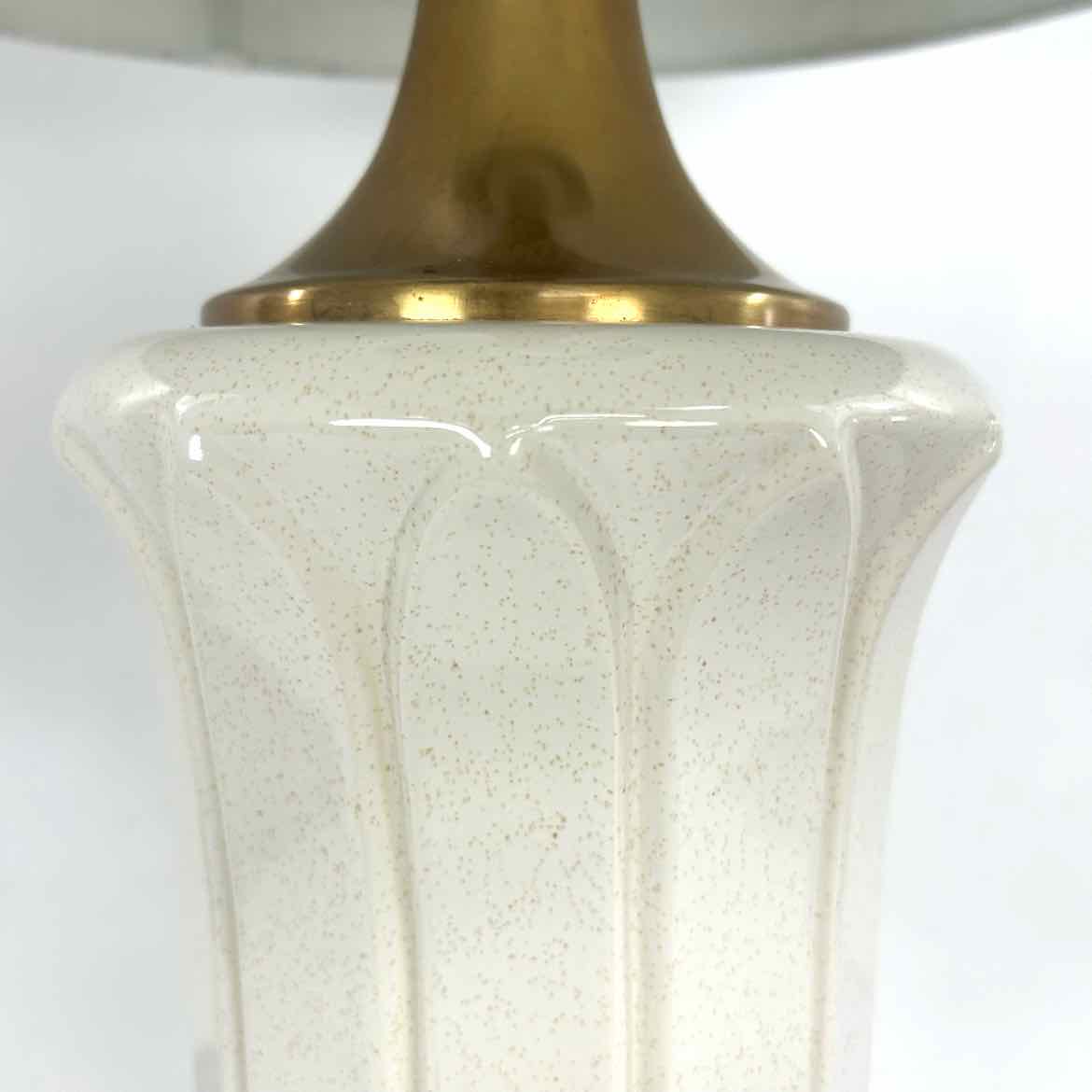 Gorgeous mid-century traditional 3-way table lamp with a turn switch on the brass base, speckled ivory ceramic body, and brand new white linen drum shade. In excellent vintage condition.