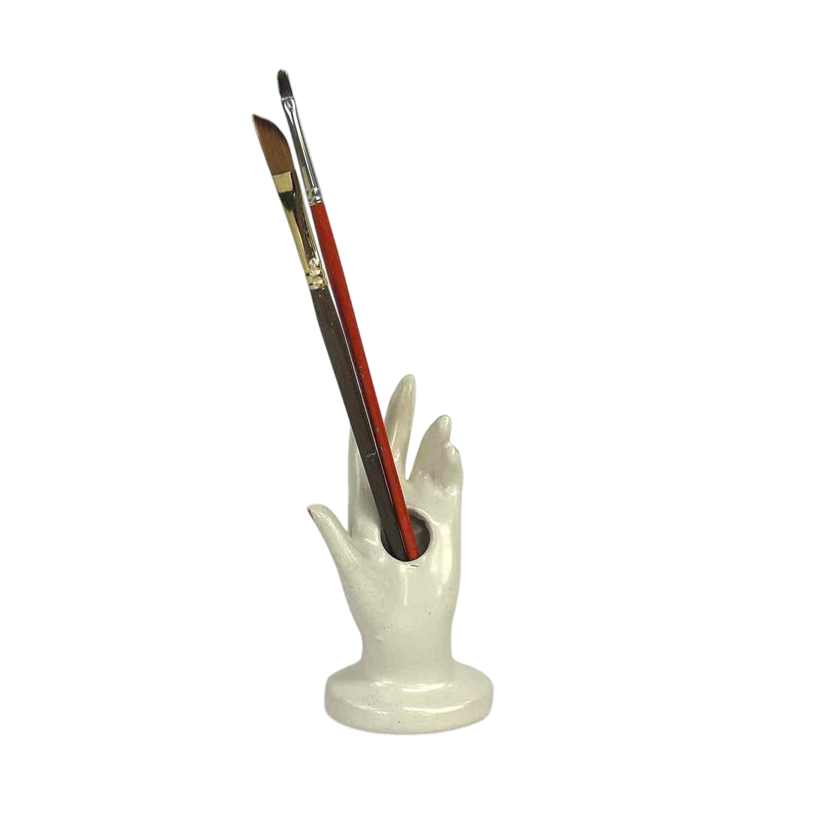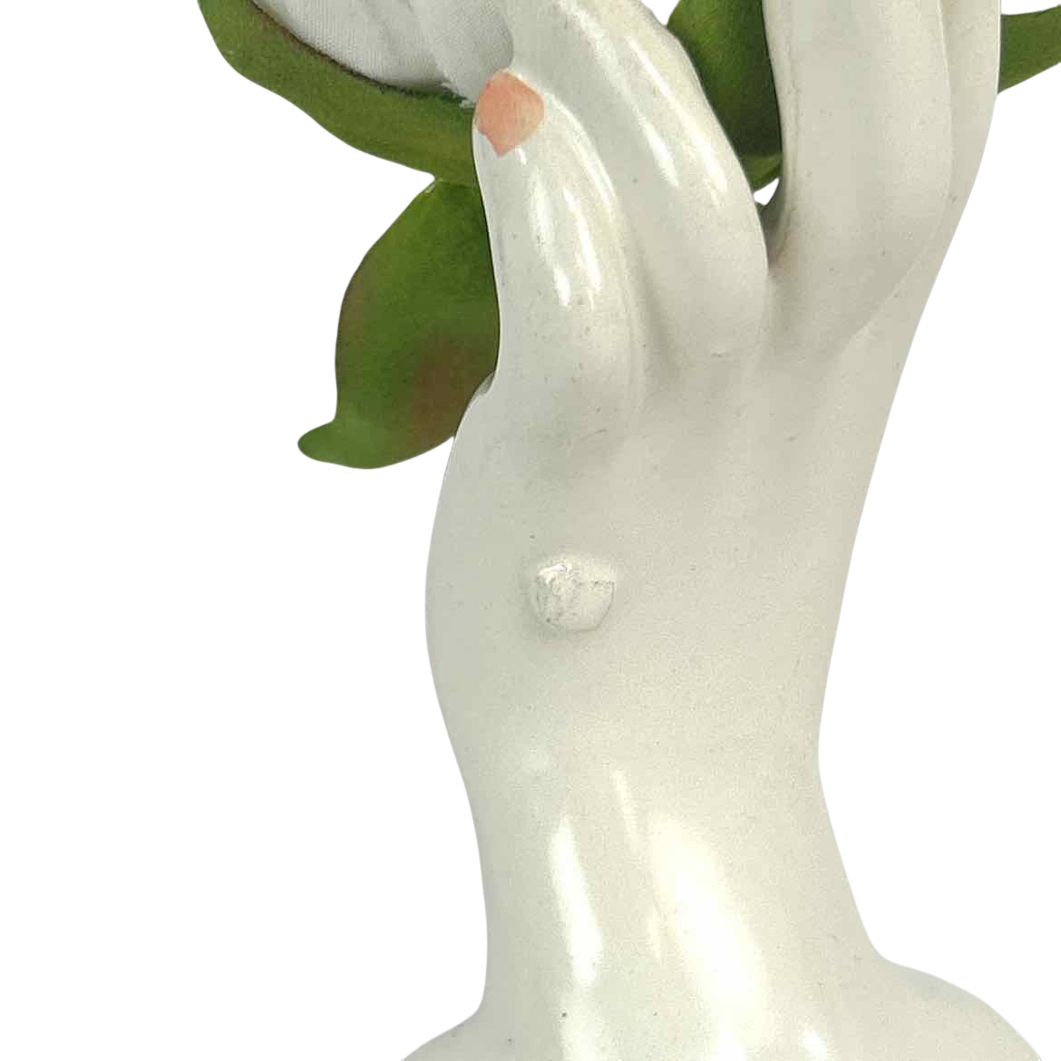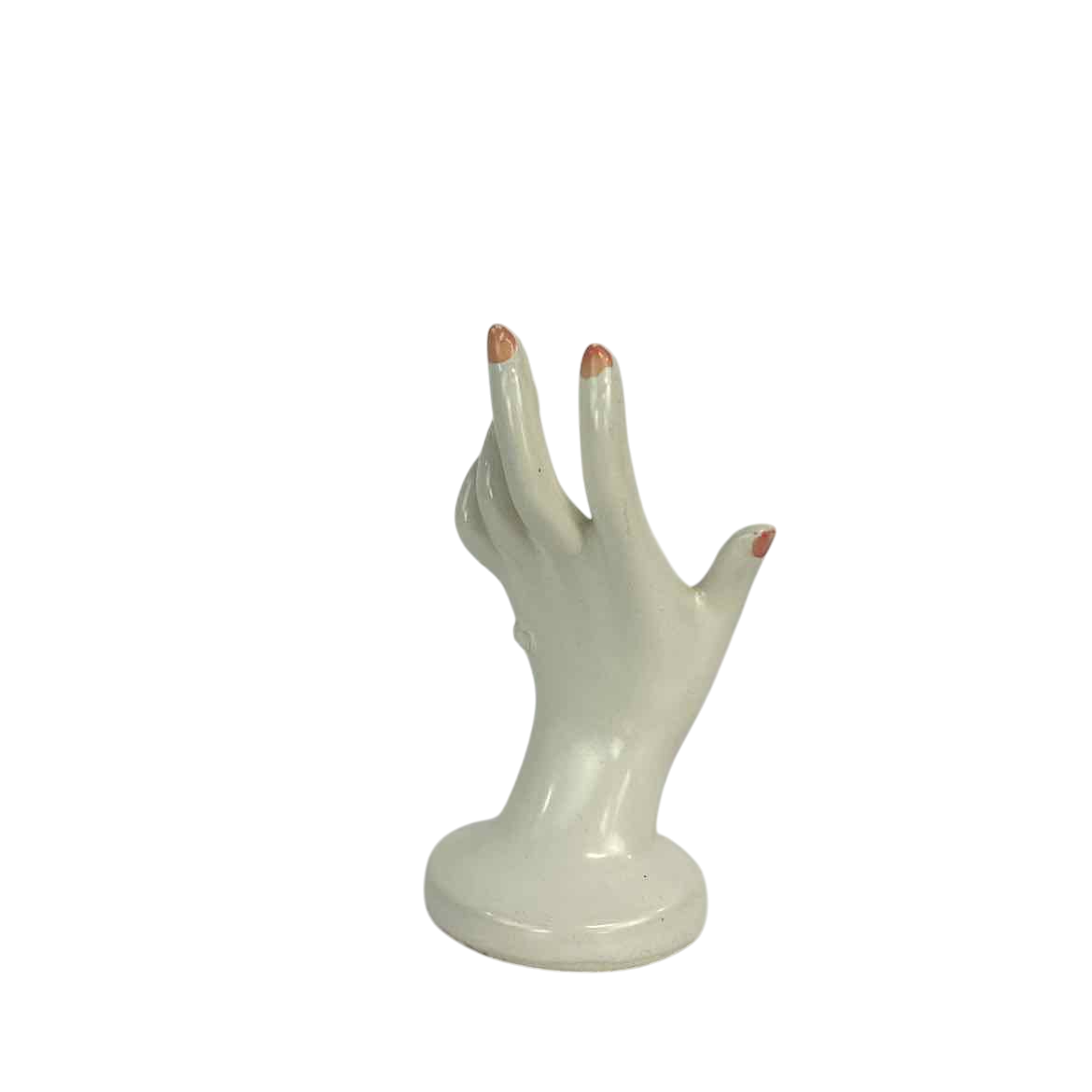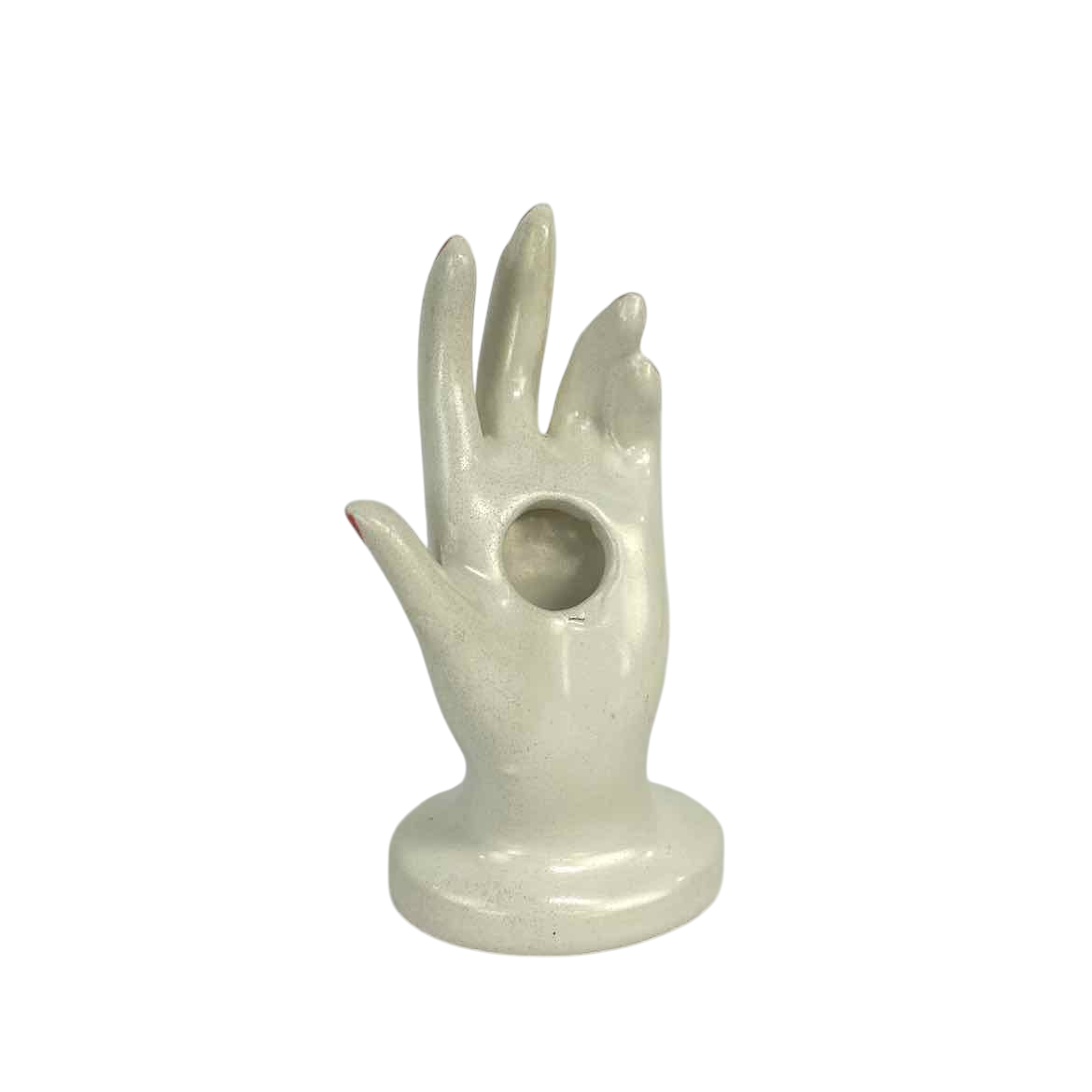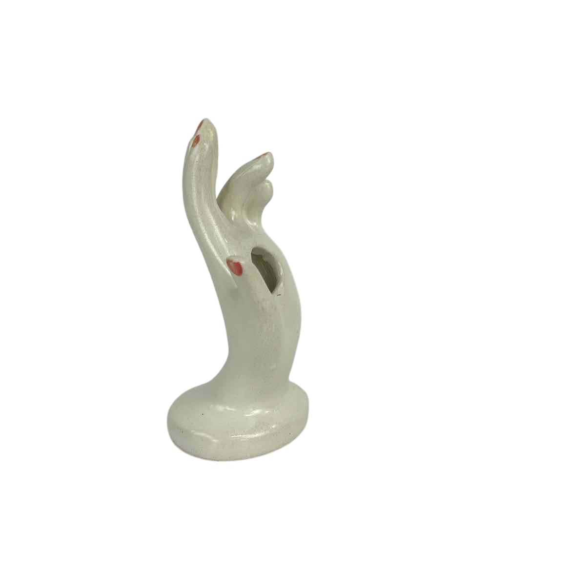 SINGLE mid-century pottery or ceramic ladies hand miniature bud vase in white with pink nails. Has a factory flaw, but otherwise excellent vintage condition with no cracks or chips. Would be sol cute to hold a slim makeup brush on a vanity!