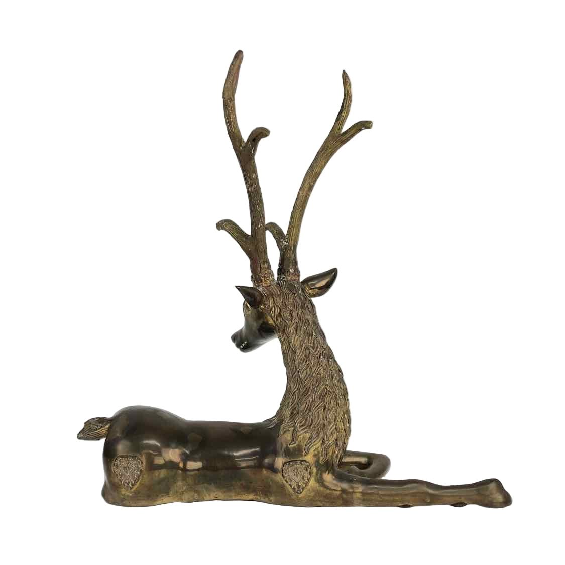 Large, heavy brass sitting reindeer with ornate details around the neck and saddle. In excellent vintage condition with original patina. Can be polished to a higher shine. | The sale of this item benefits Meals on Wheels in Midland, Texas.