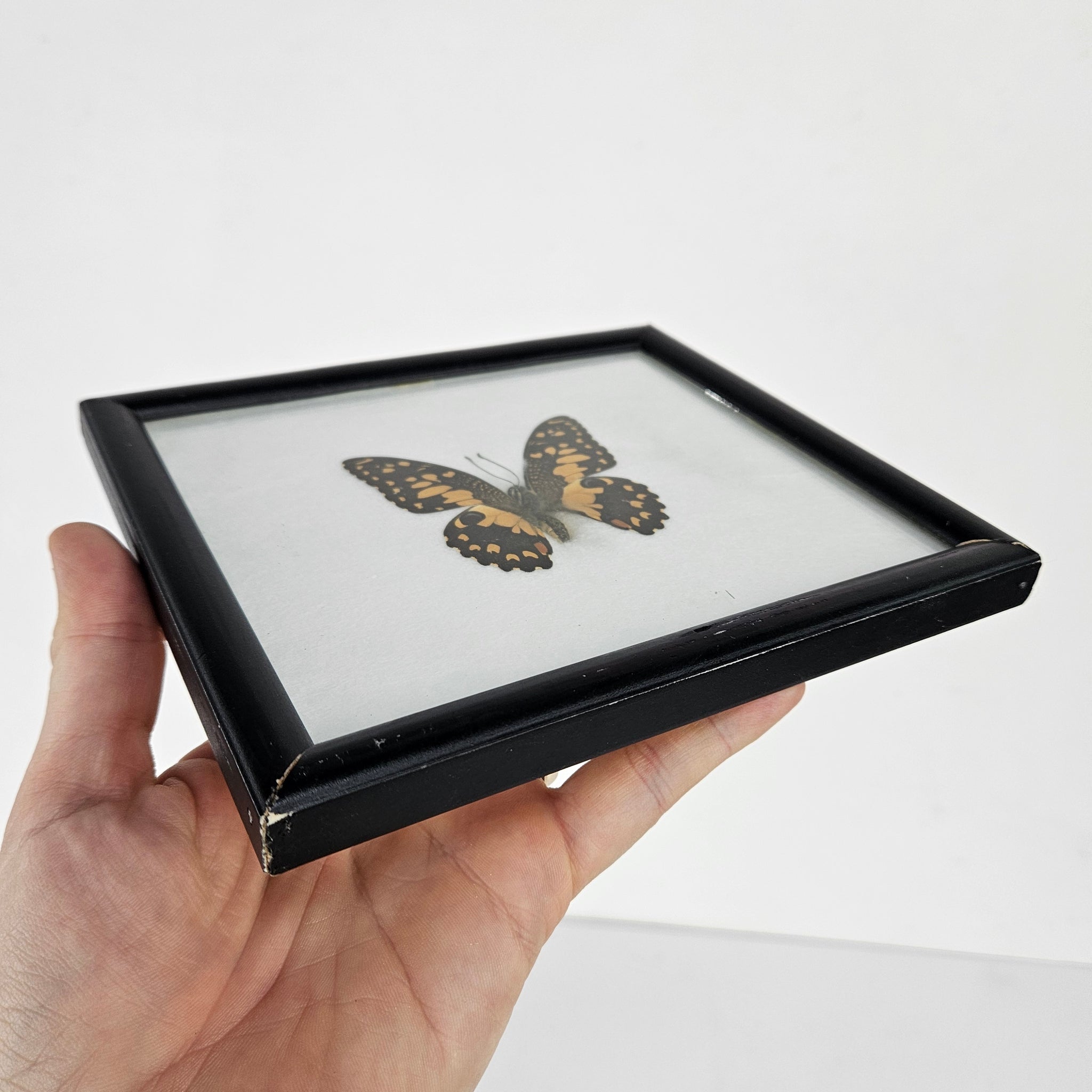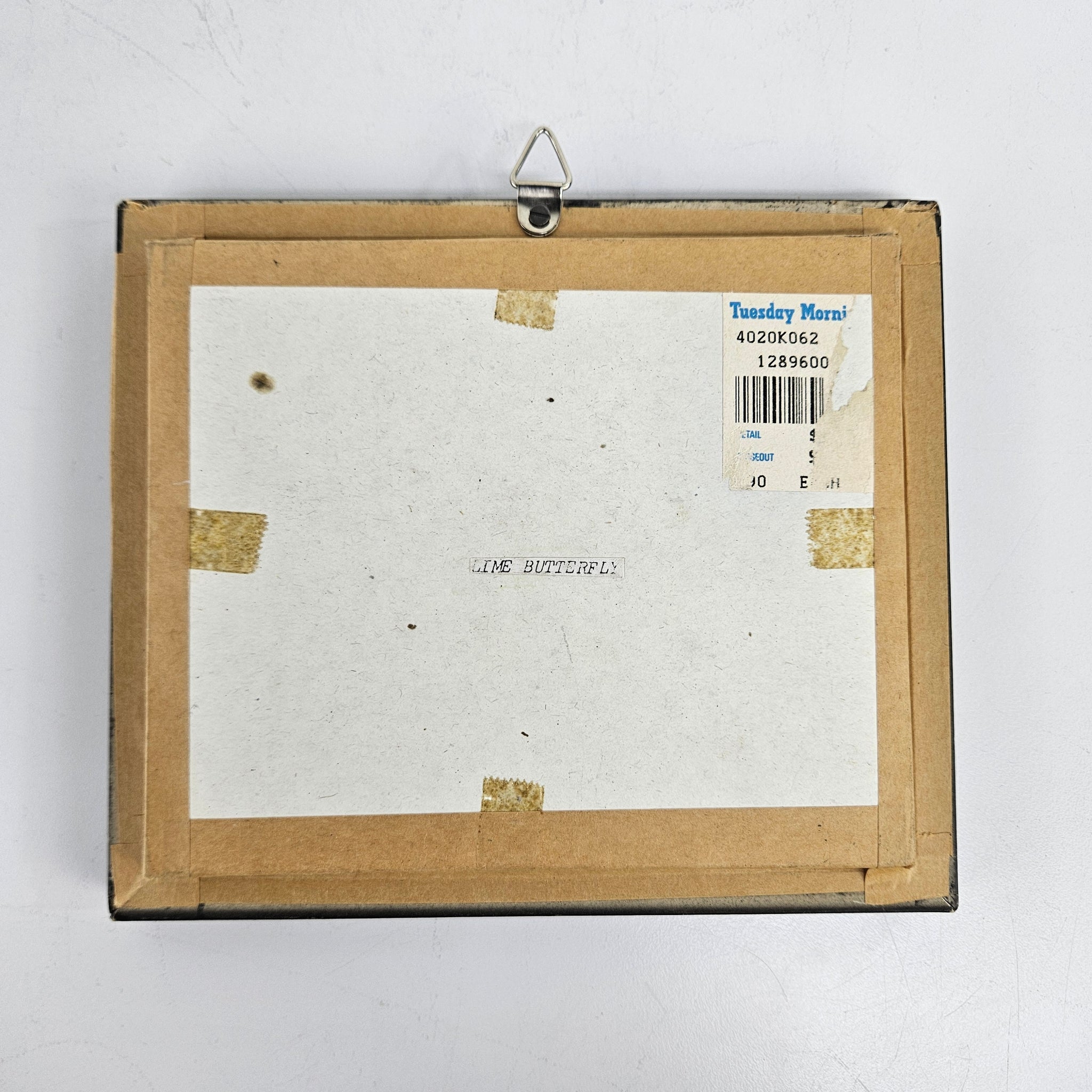 Vintage framed Lime Butterfly (Papillio demolus) specimen in white fiber and a black wooden framed. The back has a vintage Tuesday Morning tag. In very good vintage condition with a bit of patina from age that gives it a nice vintage look.