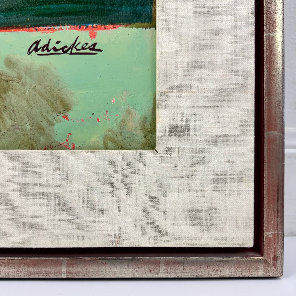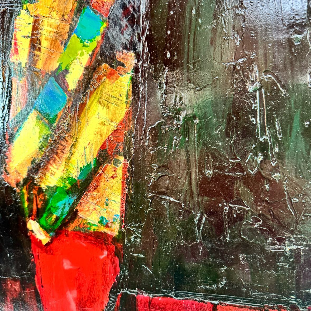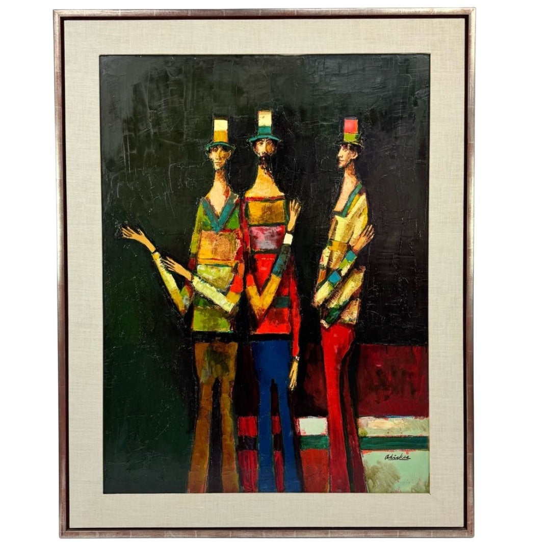Original painting of three men in bright clothing by Texas artist David Adickes. This artist is well known for his large scale sculptures, but this piece is still a rare find for a collector.