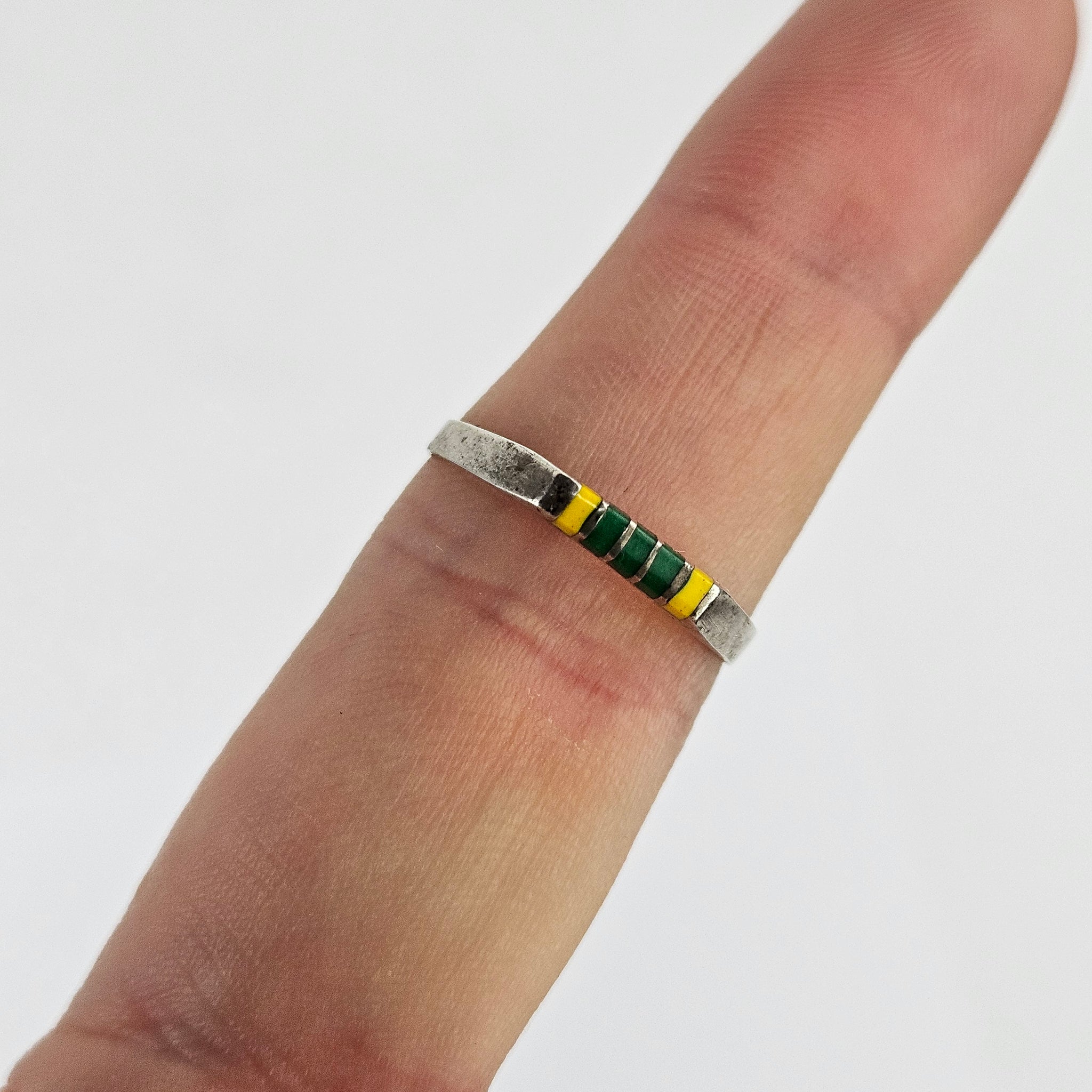 Delicate minimal modernist green & yellow inlay sterling silver ring, stamped and in excellent vintage condition. Most likely made in Mexico, this ring is timelessly stylish and cool.