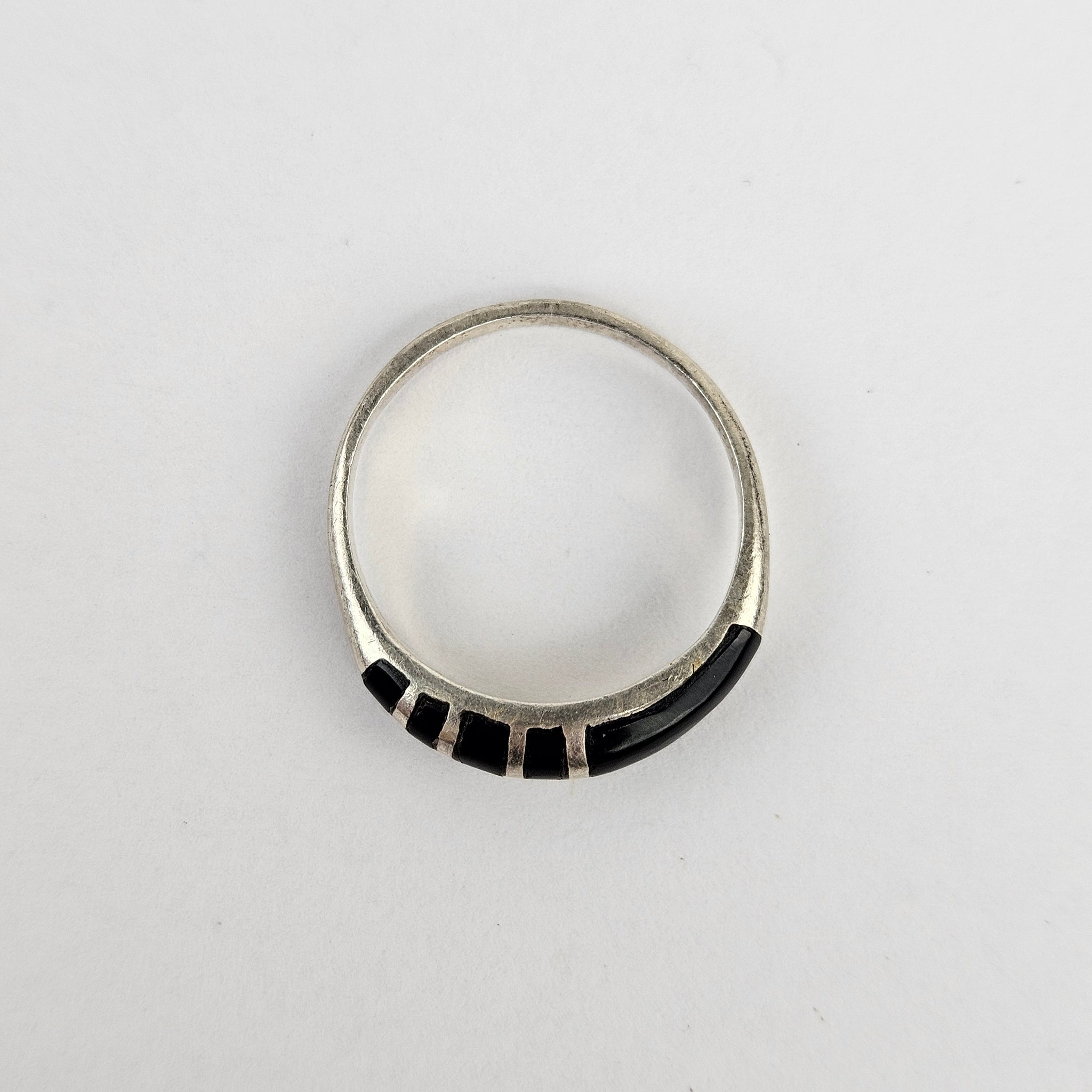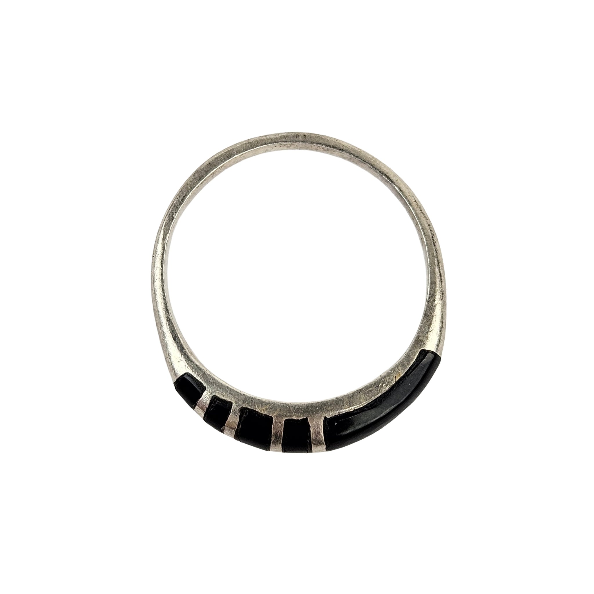 Minimal modernist black onyx inlay sterling silver ring, stamped .925 and in excellent vintage condition. Most likely made in Mexico, this ring is timelessly stylish and cool.