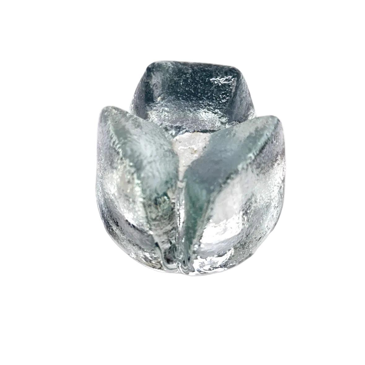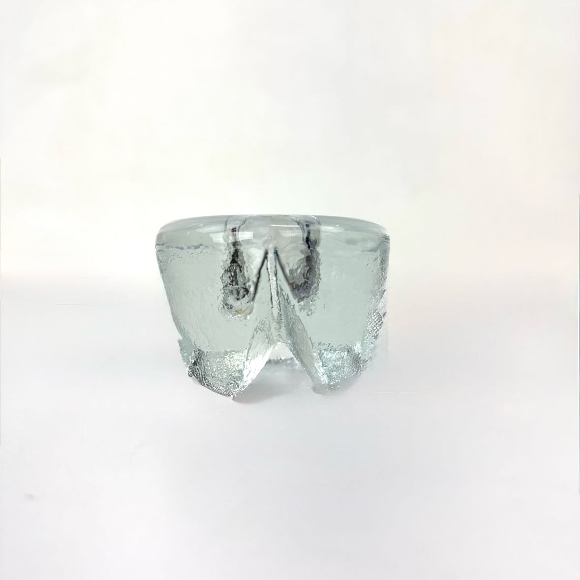 Single mid-century modern Blenko glass taper candle holder with ice textured tripod bases shaped a bit like a molar. In excellent vintage condition, c. 1960s.