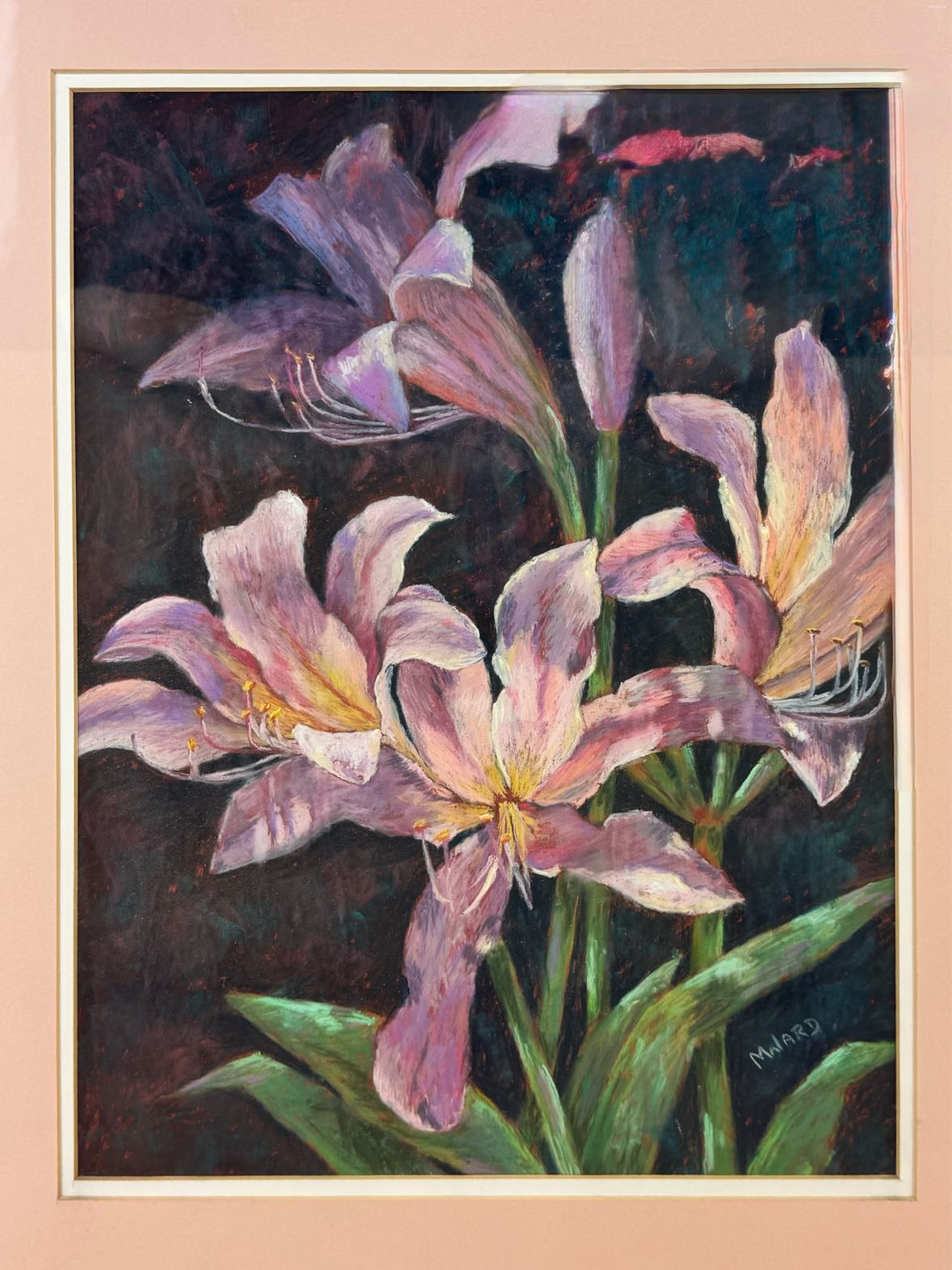 Framed pastel art of lily flowers in excellent vintage condition and ready to hang. Signed by Odessa, Texas artist Marsha Ward (1945-2022). Matted and framed in a modern gold frame.