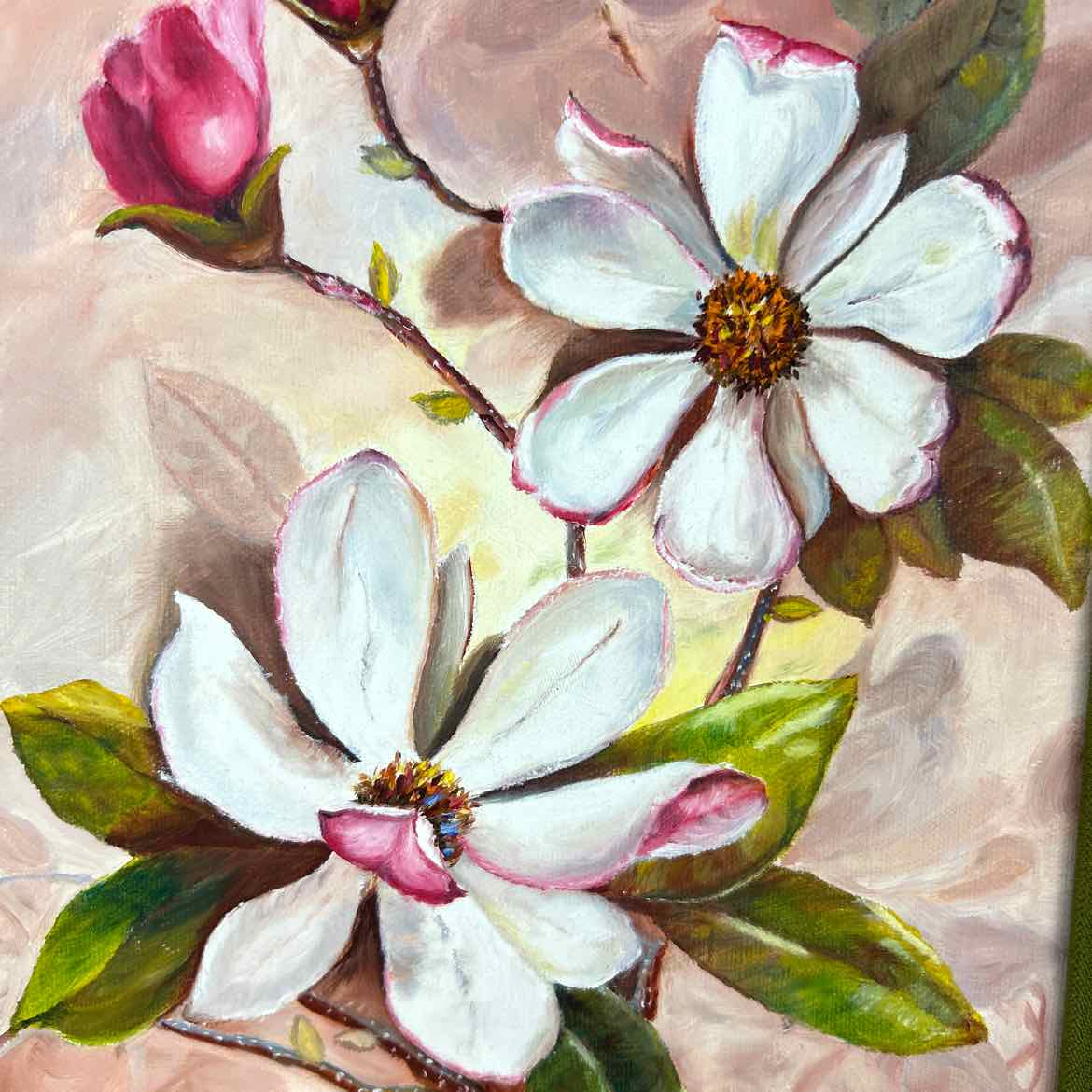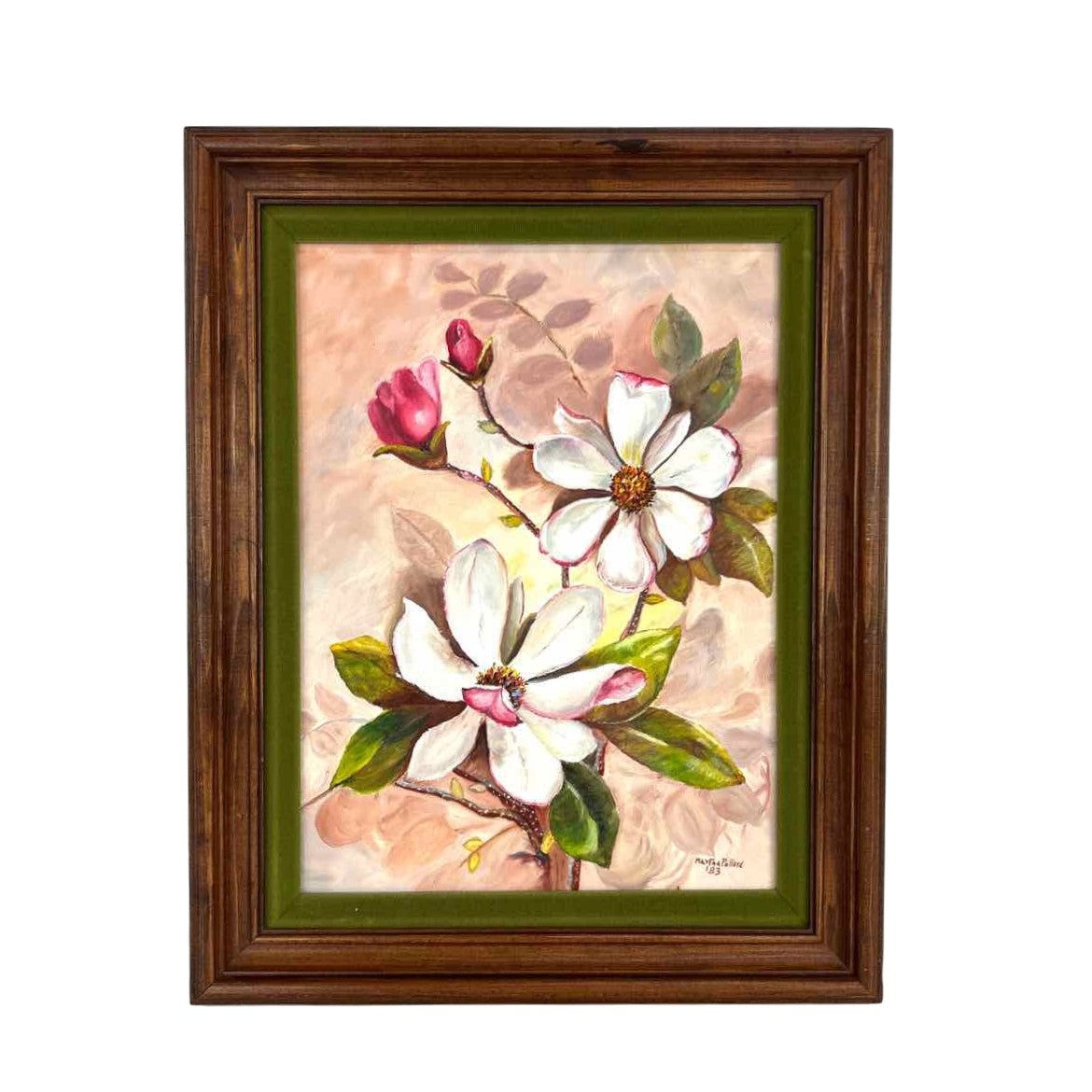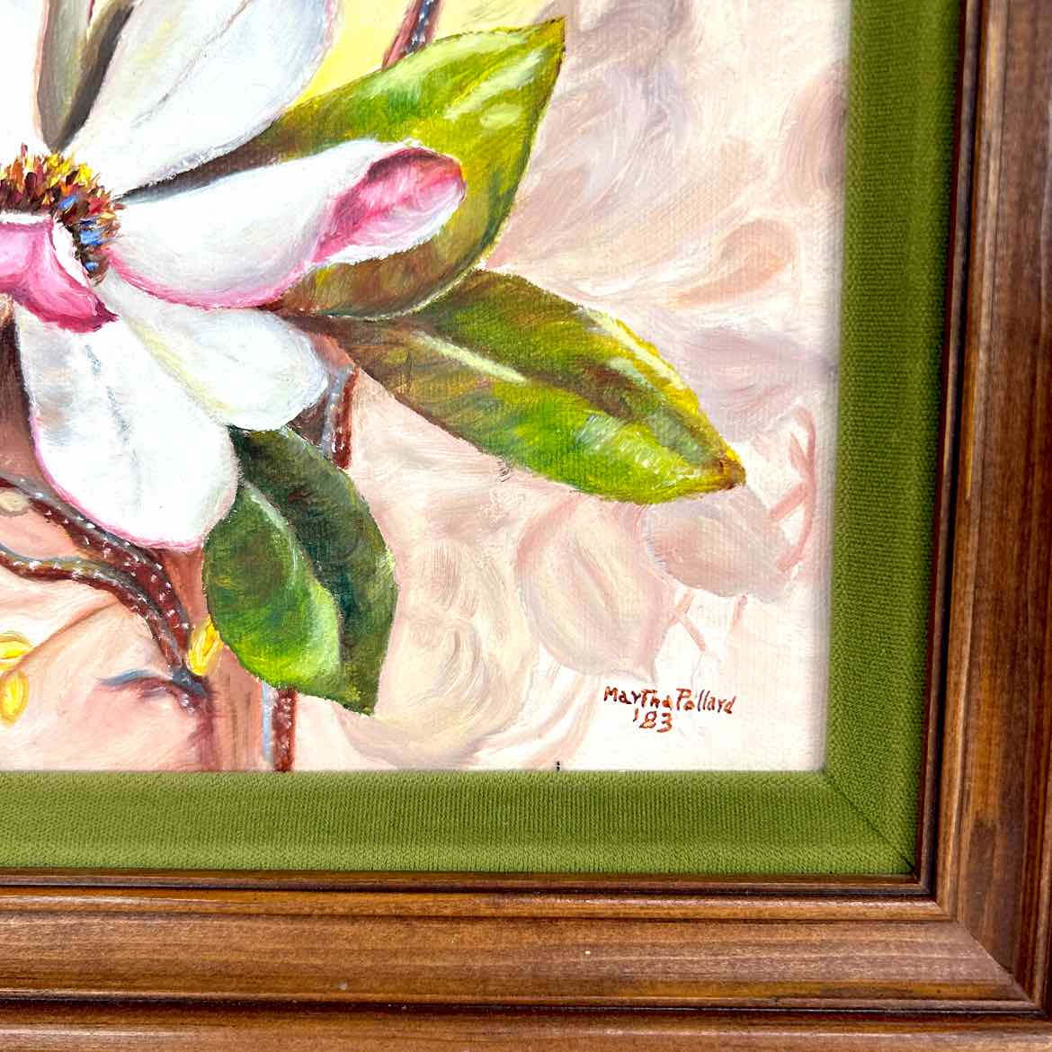 Original floral painting with rich pinks and ivory flowers (dogwood? I'm not certain), with leaves and buds, professionally in a solid wooden frame with a green velvet inlay. In excellent vintage condition, signed Martha Pollard '83.