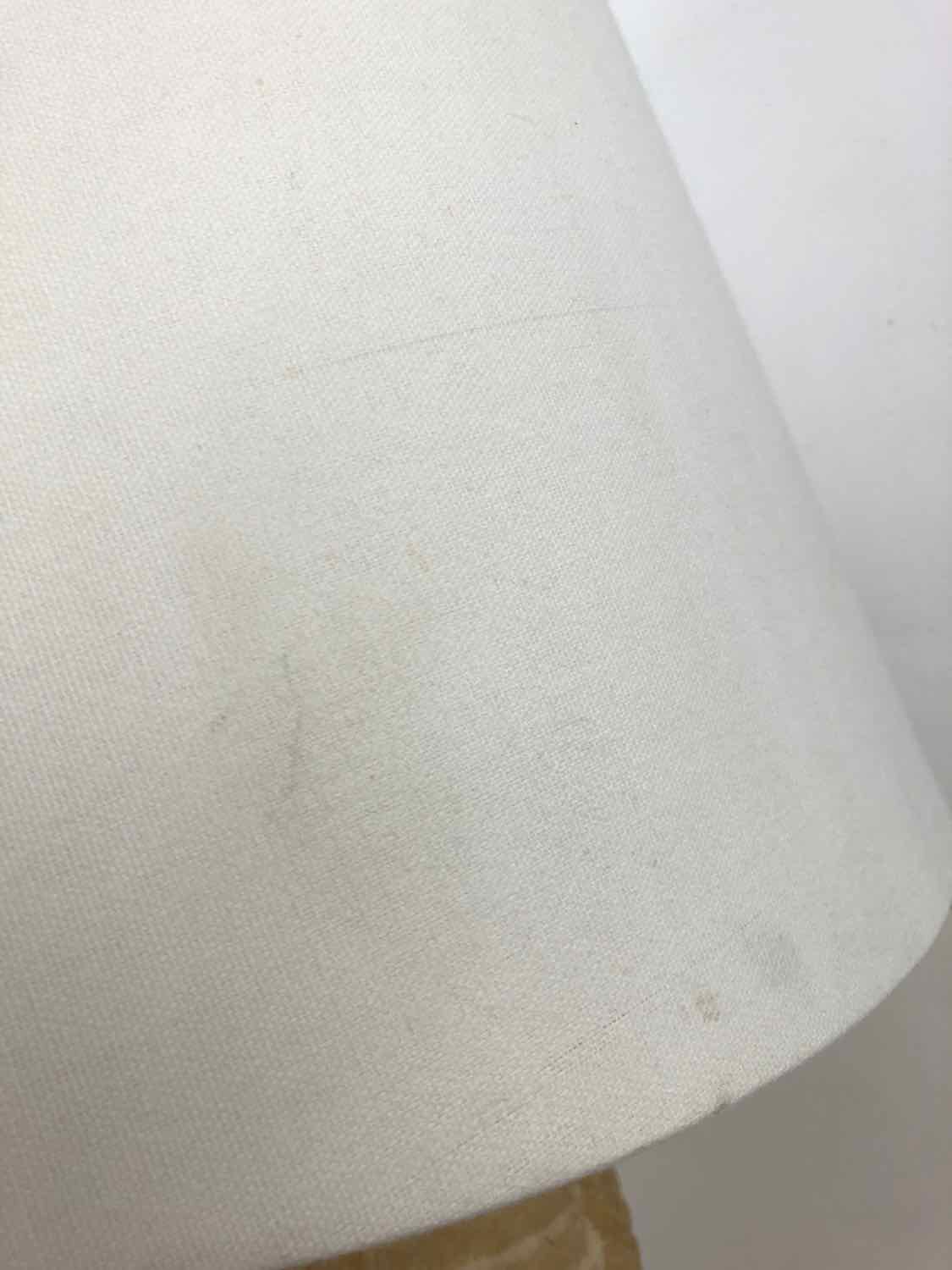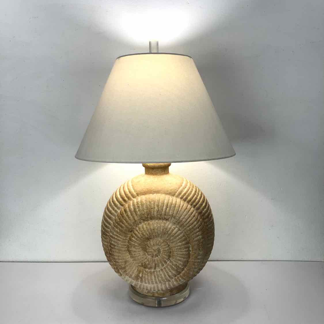 Bublous pink nautilus shell lamp c. 1980s with a limed texure and tapered linen shade. It has a lucite base and finial, and is in very good vintage condition except for a few small spots on the shade.