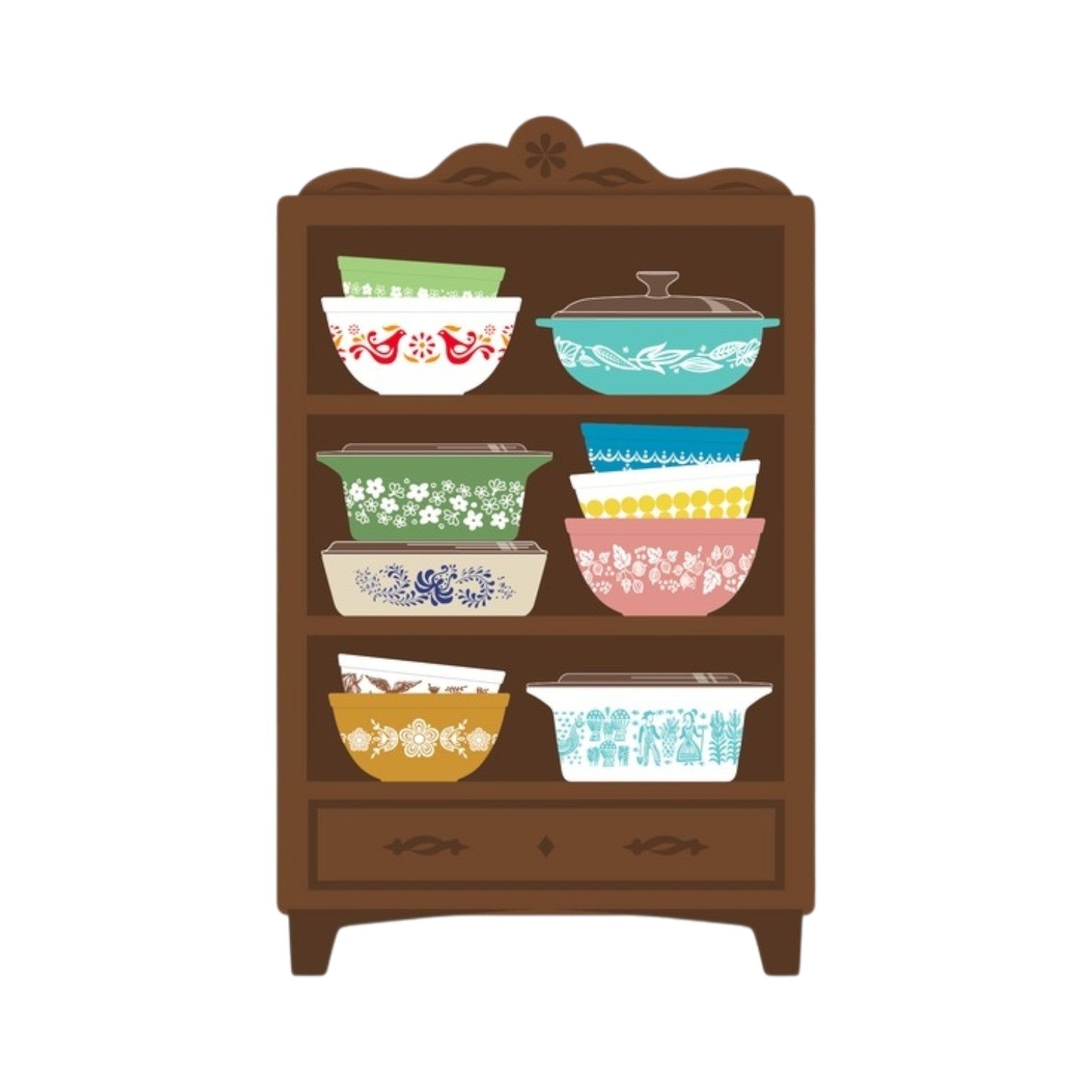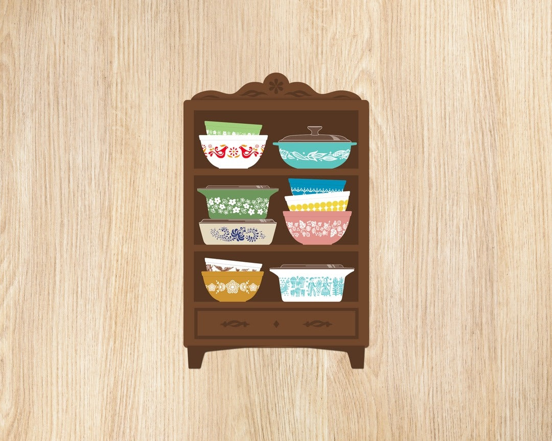 Large illustrated sticker of Pyrex dishes on a wooden shelf, made from thick, waterproof vinyl that's scratch, rain & sunlight resistant. Perfect for collectors!