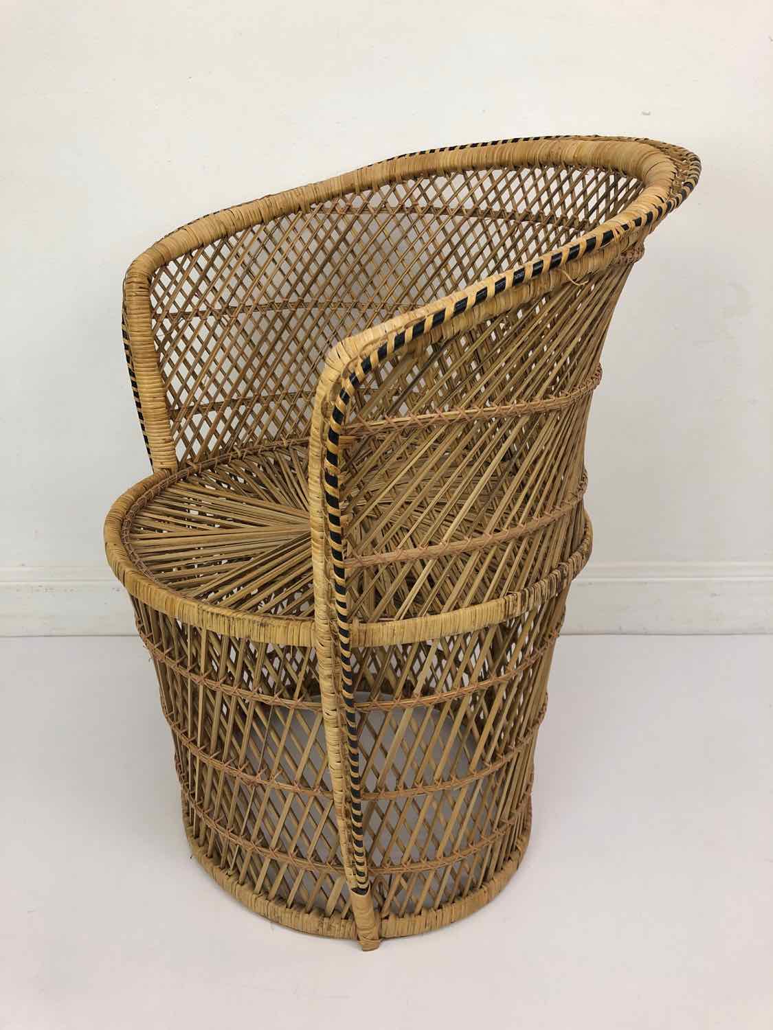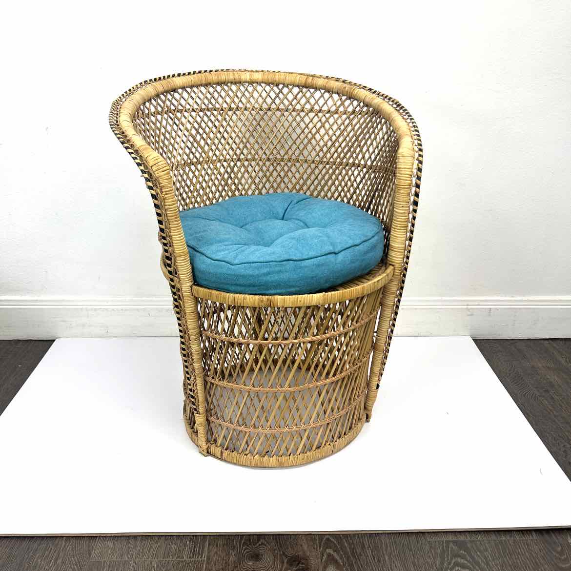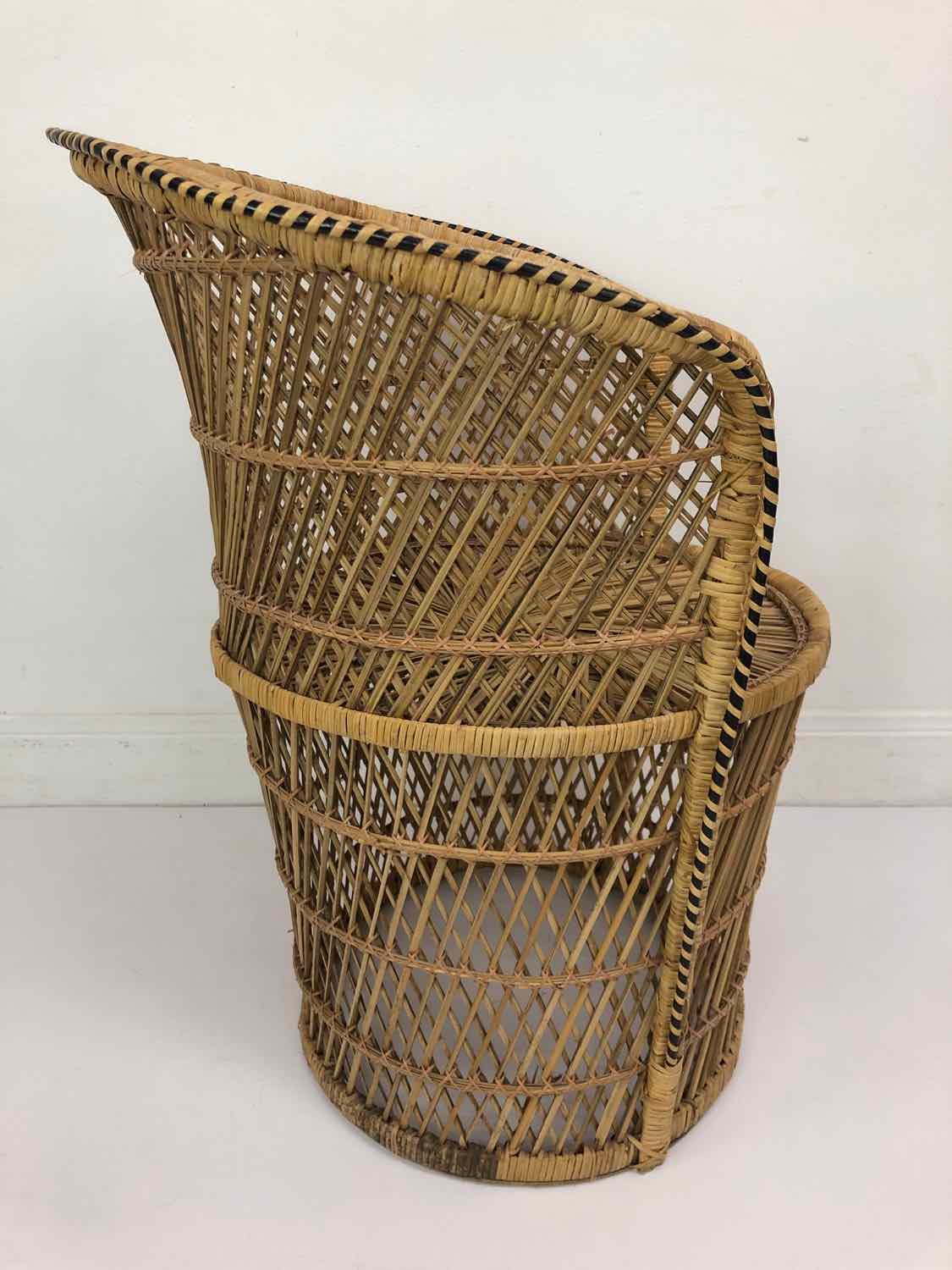 Small rattan barrel chair with a cushion. It can hold an adult, but also a larger child. Seat height could be increased by adding a cushion. In very good vintage condition. Peacock chairs are hard to find, so this one won't last!