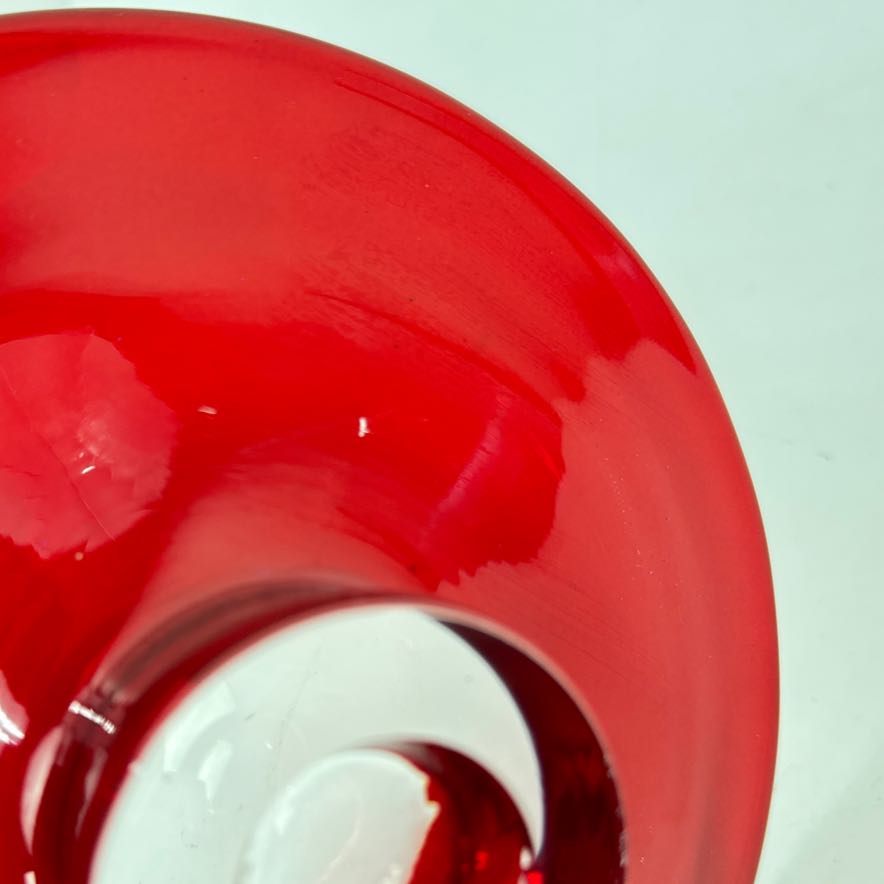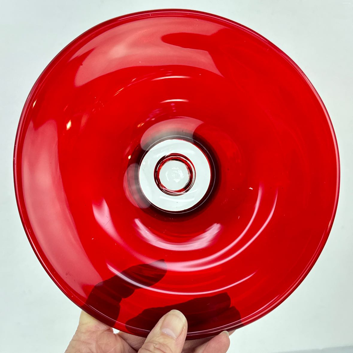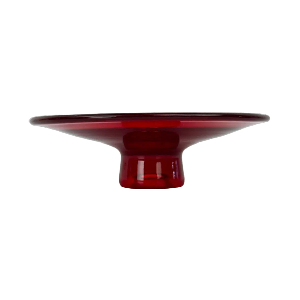 Hand blown glass compote or pedestal platter in bold red, perfect for serving a cake, displaying crystals, or just to make a pretty stand for letters on the entryway table. Very good condition, some scuffs.