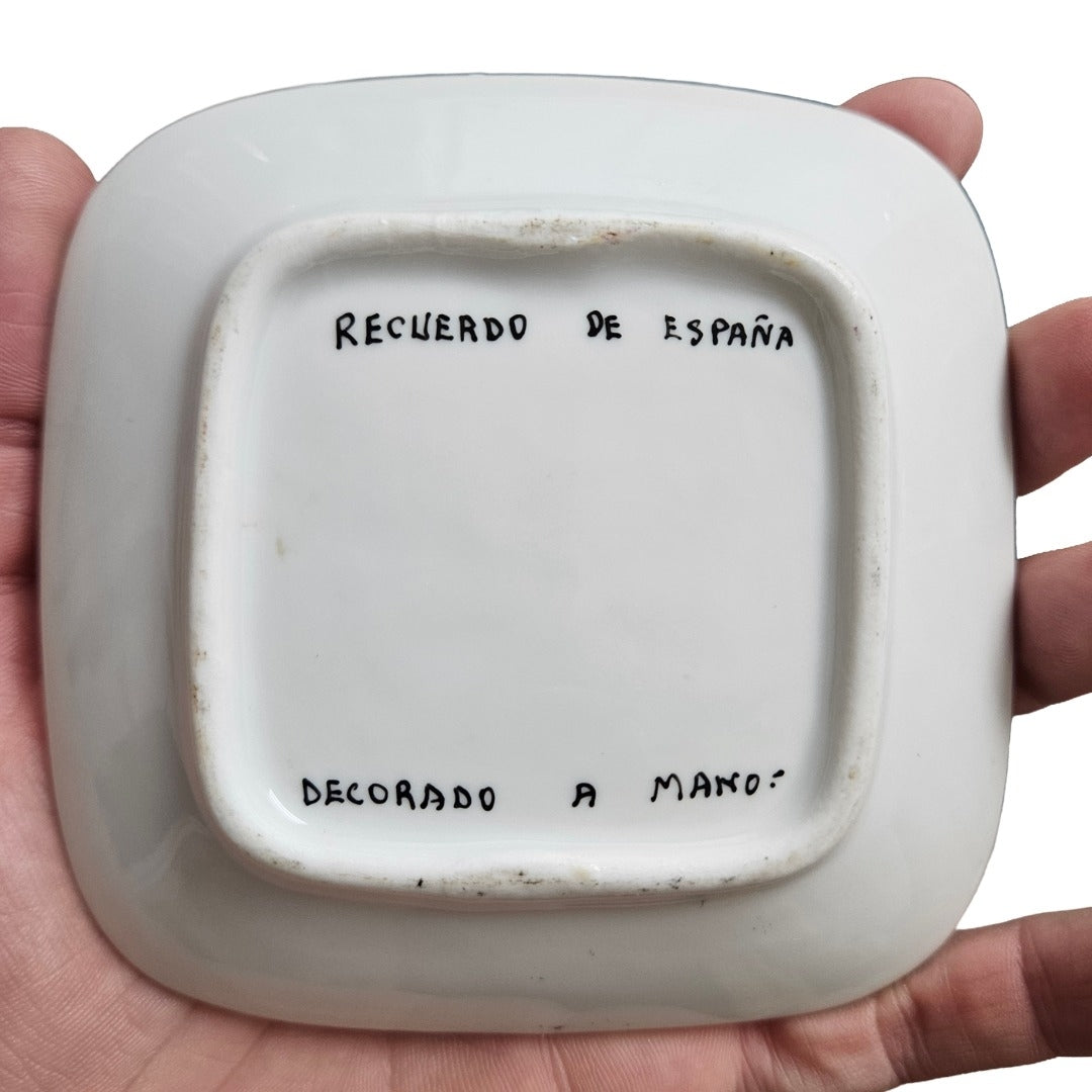 Small hand painted pottery trinket dish from Spain featuring a bull and matador design. This vintage tourist souvenir is in excellent vintage condition.