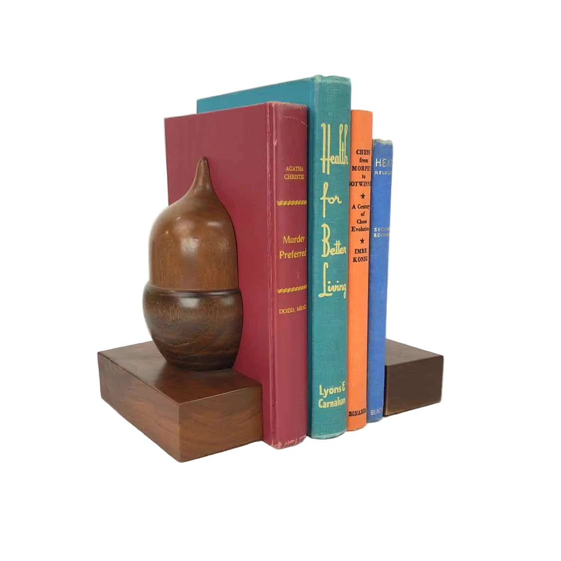 Mid-century solid walnut wooden bookends in the shape of acorns on a base, in excellent vintage condition.